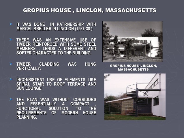 07 12 2012 · gropius house linclon massachusettsit was done in patrnership withmarcel breller in linclon 1937 38 there was an extensive use oftimber reinforced with some steelmembers lends a different andsofter character to the building timber cladding was hung gropius house linclon vertically massachusettsinconsistent use of elements likespiral stair to roof terrace andsun lounge the plan was